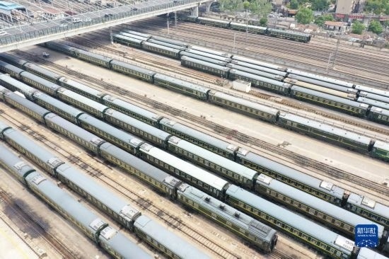 4月28日拍攝的中國鐵路上海局集團(tuán)有限公司徐州站客車整備場內(nèi)的臨時旅客列車(無人機(jī)照片)。