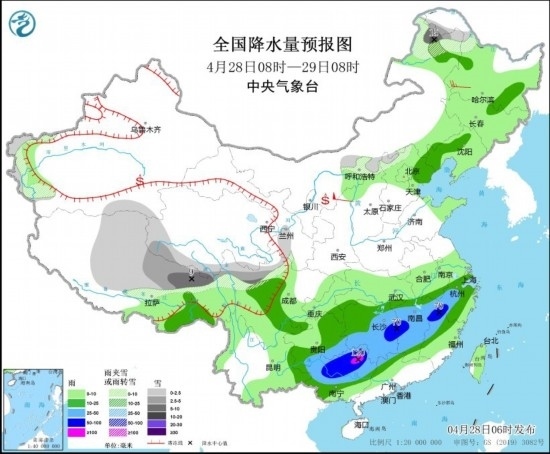 4月28日08時至29日08時,內(nèi)蒙古東北部、黑龍江西北部、新疆南疆盆地西部、西藏北部和東部、青海南部和西部、川西高原北部等地部分地區(qū)有小到中雪或雨夾雪,其中,內(nèi)蒙古東北部、西藏東北部等地部分地區(qū)有大到暴雪(10~15毫米)。遼寧西部、西藏東南部、河北東北部、江南大部、西南地區(qū)東南部、華南北部和西部等地部分地區(qū)有中到大雨,其中,湖南東部、江西中北部、福建西北部、浙江西部、廣西北部等地部分地區(qū)有暴雨或大暴雨(100~120毫米)。內(nèi)蒙古中西部部分地區(qū)有4~6級風,陜西北部局地有7~8級風。