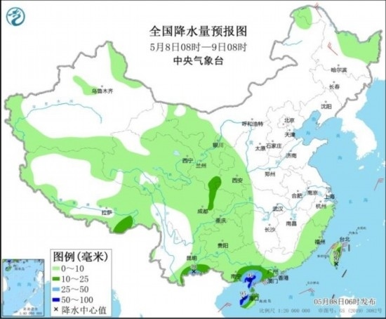 全國(guó)降水量預(yù)報(bào)圖(5月8日08時(shí)-9日08時(shí))