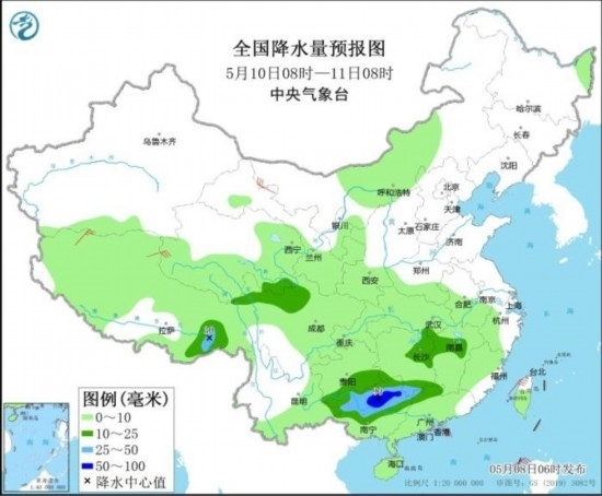 5月10日08時(shí)至11日08時(shí),甘肅南部、青海南部、西藏北部等地部分地區(qū)有小到中雪或雨夾雪,部分地區(qū)有大到暴雪;湖南中南部、江西中北部、西南地區(qū)東南部、華南北部和西部等地部分地區(qū)有中到大雨,其中,廣西北部等地部分地區(qū)有暴雨(50~90毫米)。西藏北部和西部、甘肅河西等地部分地區(qū)有4~6級(jí)風(fēng)。