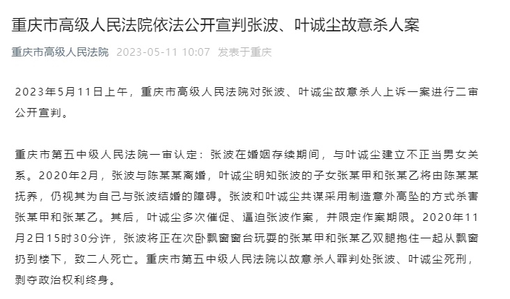 ·重慶市高級(jí)人民法院裁定張波、葉誠塵故意殺人案駁回上訴,維持原判。