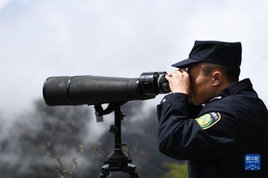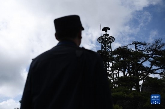 4月20日,在黃山風景區(qū),瞭望哨防火小隊隊員汪新平在用望遠鏡觀測山林。