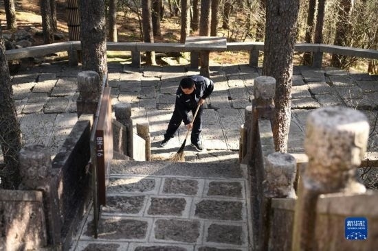 4月21日,在黃山風景區(qū)平天矼瞭望哨門口,秦志平在打掃山道。