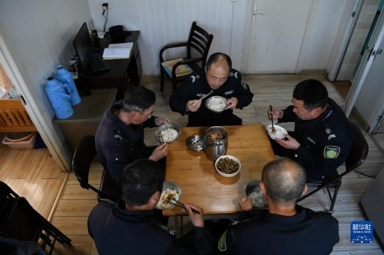 4月20日,在黃山風景區(qū)平天矼瞭望哨內(nèi),瞭望哨防火小隊5名隊員在吃晚飯,右一為秦志平。