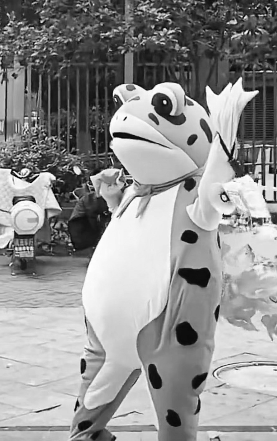 讓童女士沒想到的是,第二次穿著青蛙人偶服出去“賣崽”就引發(fā)大量關注,“賣崽青蛙”在路人視角隨手拍攝的視頻中火了。