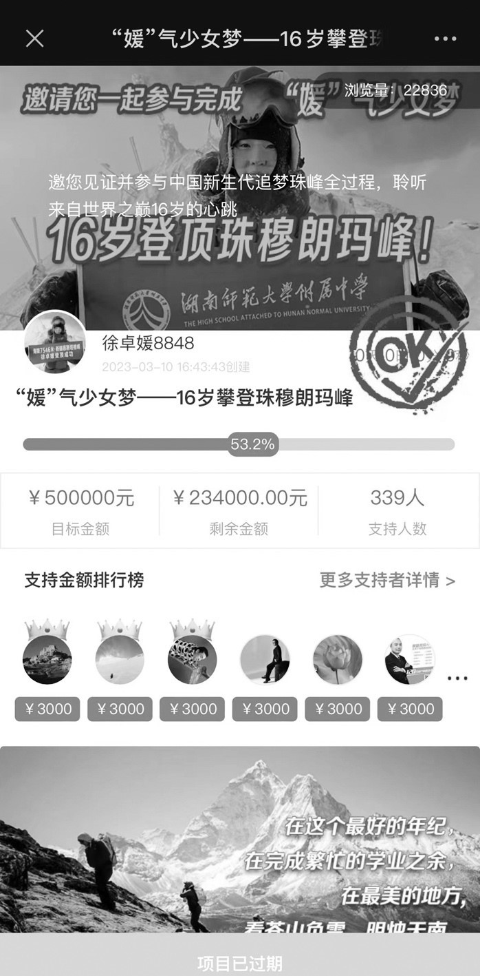 5月15日,揚(yáng)子晚報(bào)紫牛新聞?dòng)浾咴俅吸c(diǎn)開(kāi)徐卓媛當(dāng)初發(fā)起助力登峰的眾籌鏈接,發(fā)現(xiàn)該項(xiàng)目已過(guò)期,籌款進(jìn)度最終定格在53.2%,最終籌集到資金266000元。除去徐江雷朋友們贊助的這二十多萬(wàn)元,據(jù)了解,還有一些企業(yè)也出資贊助了徐卓媛登頂珠峰的活動(dòng)。徐江雷此前告訴記者,江蘇一家藥企看到此前揚(yáng)子晚報(bào)對(duì)于徐卓媛的報(bào)道后(本報(bào)今年3月17日刊登《眾籌50萬(wàn),助16歲女兒挑戰(zhàn)珠峰》一文),被她小小年紀(jì)敢于攀登高峰的精神所打動(dòng),秉承著“少年強(qiáng)則國(guó)強(qiáng)”的理念,慷慨贊助徐卓媛登山資金30萬(wàn)元。