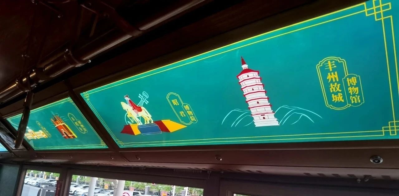 除了復(fù)古風(fēng)的車身外型,主題車廂內(nèi)也充滿了如詩如畫的文旅元素,為乘客們顯示了五塔寺、昭君博物院、豐州故城博物館等本土旅游勝地,乘坐鐺鐺車,乘客在瀏覽美麗街景的同時,也可通過車內(nèi)看板了解到青城的名勝古跡。