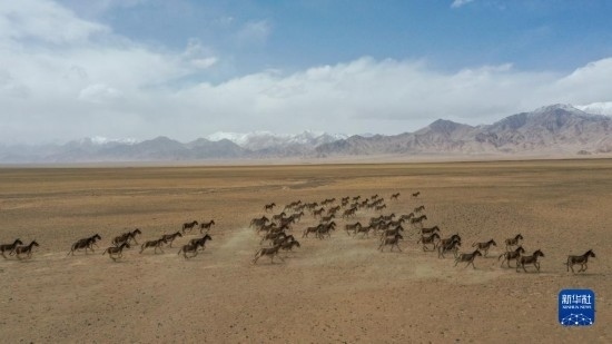 一群藏野驢在阿爾金山國(guó)家級(jí)自然保護(hù)區(qū)奔跑(5月23日攝)。