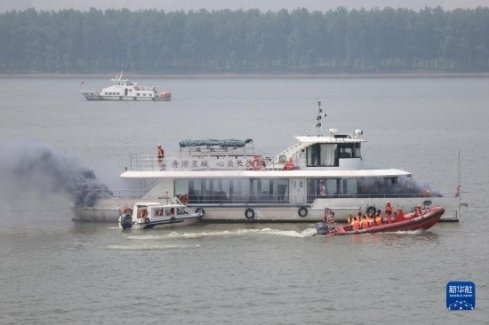 6月2日,在水域救援實(shí)戰(zhàn)演習(xí)現(xiàn)場,消防救援人員駕駛快艇模擬救援事故船上的遇險(xiǎn)群眾。