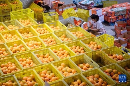 6月8日,在秭歸縣華維電商物流園區(qū)內(nèi),工作人員搬運臍橙。