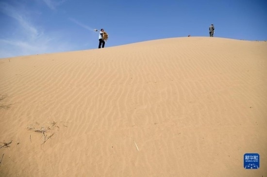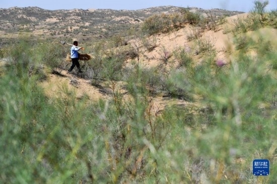 工作人員在白芨灘國家級自然保護區(qū)補扎草方格(6月7日攝)。