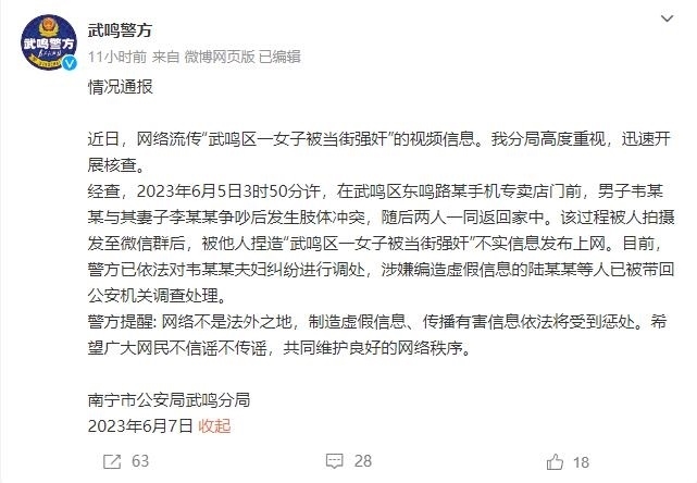 ·警方辟謠南寧一女子被當街強奸:系夫妻吵架發(fā)生肢體沖突,造謠者已帶回調(diào)查處理。