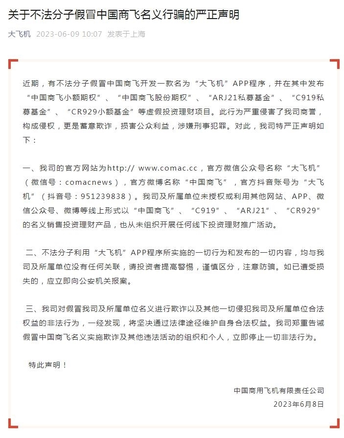 另據“大飛機”微信公眾號6月9日發(fā)布的《關于不法分子假冒中國商飛名義行騙的嚴正聲明》,有不法分子假冒中國商飛開發(fā)一款名為“大飛機”APP程序,并在其中發(fā)布“中國商飛小額期權”、“中國商飛股份期權”、“ARJ21私募基金”、“C919私募基金”、“CR929小額基金”等虛假投資理財項目。