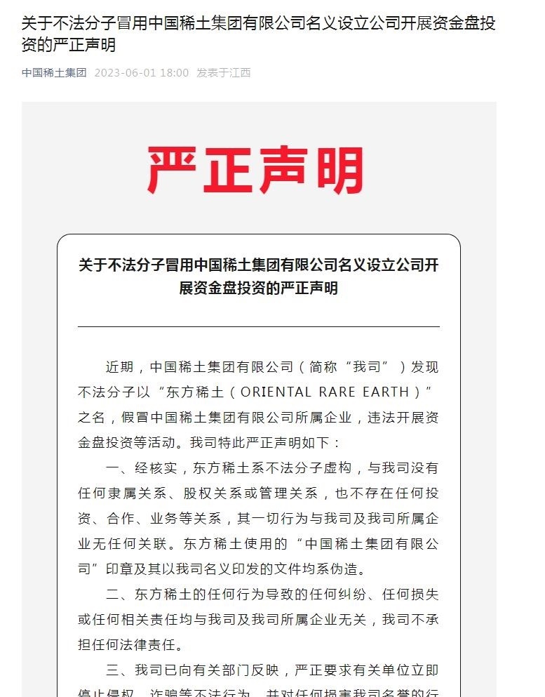 “中國稀土集團”微信公眾號曾在6月1日發(fā)布嚴正聲明提醒,近期,中國稀土集團有限公司(下稱“中國稀土”)發(fā)現不法分子以“東方稀土(ORIENTAL RARE EARTH)”之名,假冒中國稀土集團有限公司所屬企業(yè),違法開展資金盤投資等活動。