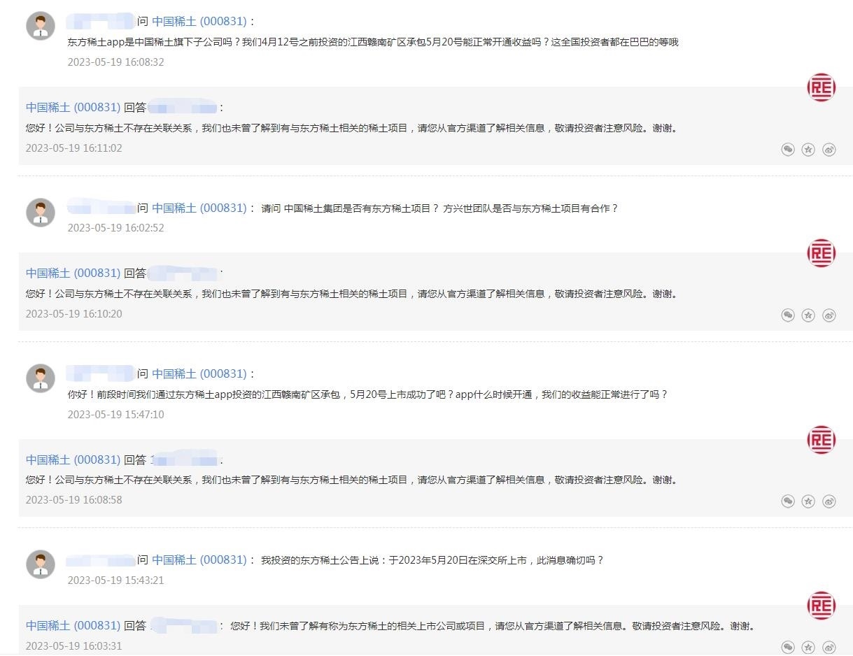 中新財經注意到,有投資者曾在互動平臺上向中國稀土詢問“東方稀土”相關信息,從提問內容看,可能已有投資者被誤導受騙。比如,“東方稀土APP是中國稀土旗下子公司嗎?我們4月12號之前投資的江西贛南礦區(qū)承包5月20號能正常開通收益嗎?”“我投資的東方稀土公告上說:于2023年5月20曰在深交所上市,此消息確切嗎?”等等。