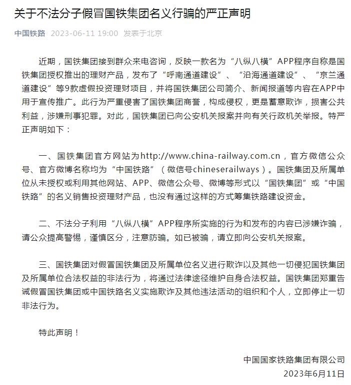 “中國鐵路”微信公眾號6月11日發(fā)布嚴正聲明稱,近期,國鐵集團接到群眾來電咨詢,反映一款名為“八縱八橫”APP程序自稱是國鐵集團授權推出的理財產品,發(fā)布了“呼南通道建設”、“沿海通道建設”、“京蘭通道建設”等9款虛假投資理財項目,并將國鐵集團公司簡介、新聞報道等內容在APP中用于宣傳推廣。