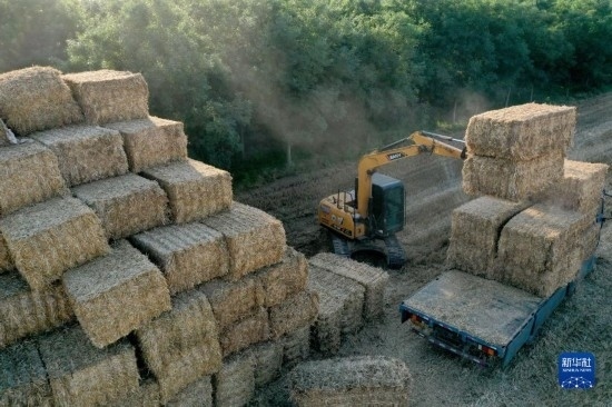6月17日,河北邢臺南和區(qū)閻里鄉(xiāng)大郝村農(nóng)民將打捆的秸稈碼垛存放(無人機照片)。