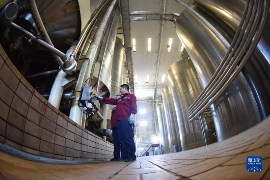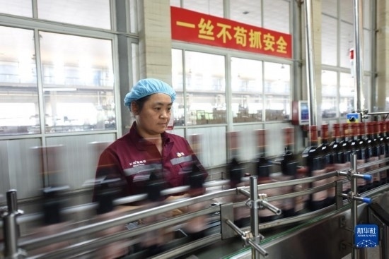 6月21日,在河北省懷來(lái)縣長(zhǎng)城葡萄酒廠(chǎng),一名工人在葡萄酒生產(chǎn)線(xiàn)上監(jiān)控生產(chǎn)情況。