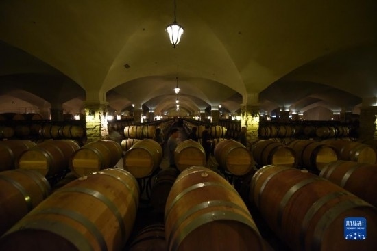 6月21日,在河北省懷來(lái)縣長(zhǎng)城桑干酒莊,游客在葡萄酒庫(kù)中參觀(guān)。