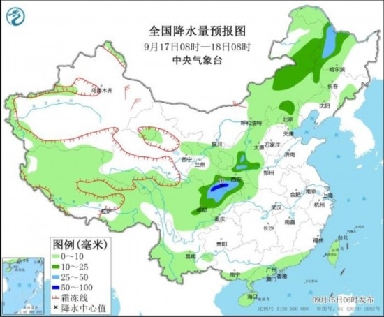 全國(guó)降水量預(yù)報(bào)圖(9月17日08時(shí)-18日08時(shí))