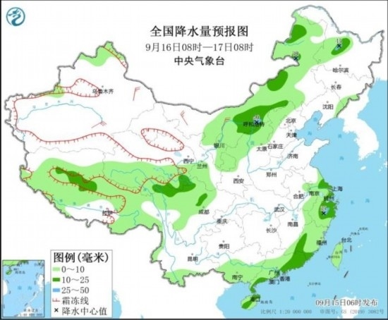 9月16日08時(shí)至17日08時(shí),內(nèi)蒙古中東部、新疆北疆北部、西藏大部、青海中南部、甘肅西南部、寧夏中東部、陜西北部、陜西北部、河北西北部、四川西北部、云南西部和南部、江蘇東部和南部、上海、浙江、福建、江西東北部和南部、廣東大部、廣西中南部、海南島、臺(tái)灣島等地部分地區(qū)有小到中雨,其中,內(nèi)蒙古中部和東北部、黑龍江西部、浙江中北部等地局地有大雨(25~45毫米)。內(nèi)蒙古西部、新疆南疆盆地和東部等地部分地區(qū)有4~6級(jí)風(fēng)。