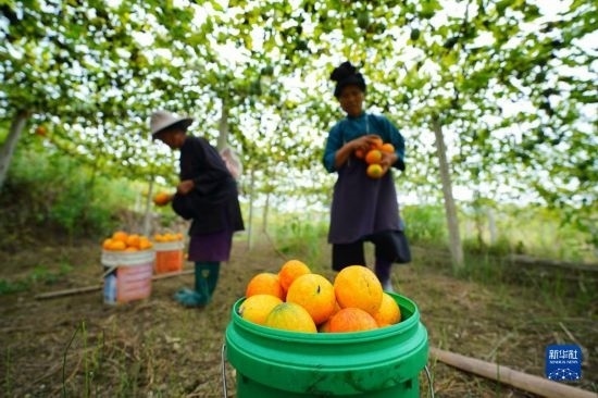 9月14日,果農(nóng)在貴州省開(kāi)陽(yáng)縣南江鄉(xiāng)龍廣村水果種植基地采摘醉金香葡萄。