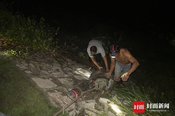 9月16日深夜,封面新聞?dòng)浾邚膹V東茂名茂南區(qū)“出逃”暹羅鱷抓捕現(xiàn)場(chǎng)獲悉,當(dāng)夜有3條暹羅鱷被專(zhuān)業(yè)人員從養(yǎng)殖場(chǎng)外的水域中抓捕上岸。9月11日,茂南區(qū)一鱷魚(yú)養(yǎng)殖場(chǎng)因洪水沖塌圍墻造成部分鱷魚(yú)“出逃”,經(jīng)過(guò)連續(xù)6天的搜尋,截至16日24時(shí),養(yǎng)殖場(chǎng)中原養(yǎng)殖的71條暹羅鱷已有69條被抓獲,僅剩2條仍在搜尋。