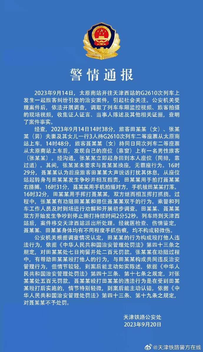 ·天津鐵路公安處就“女子坐高鐵被打”再次發(fā)布警情通報:未要求換座,無霸座行為。