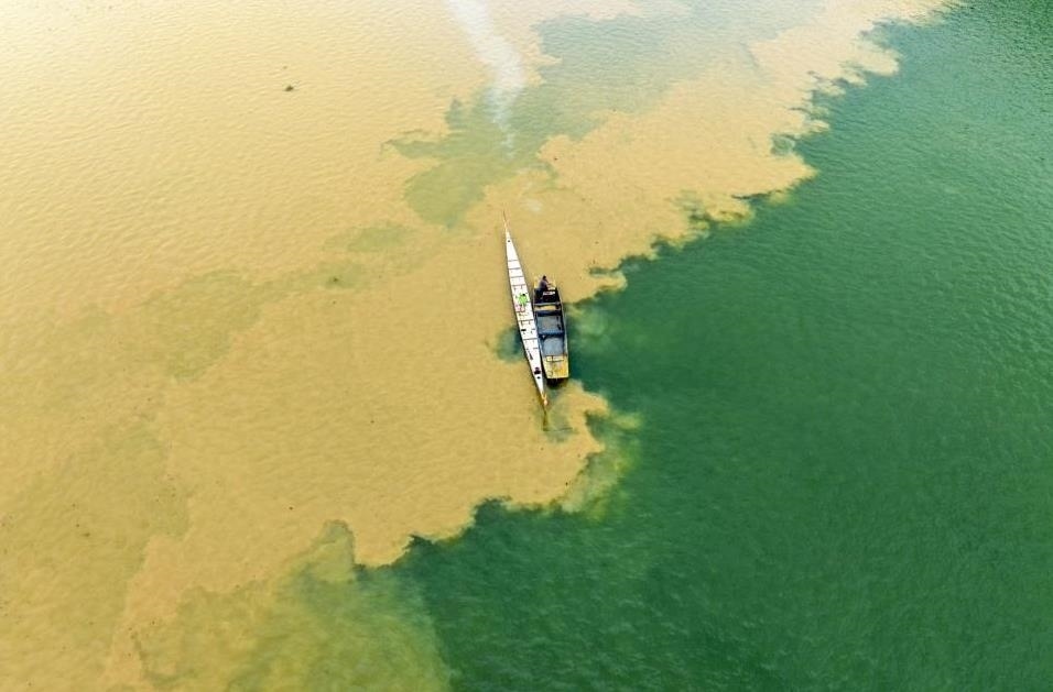 2023年9月20日,湖北襄陽,雨后的漢江河水似鴛鴦火鍋一般,呈現(xiàn)“涇渭分明”的景觀。