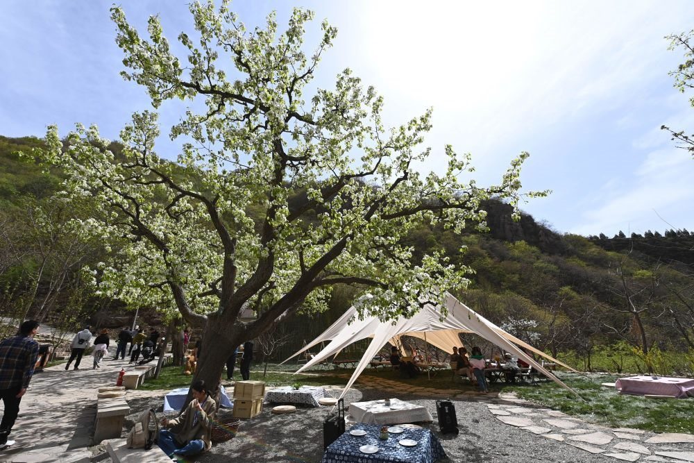 4月15日,游客在天津市薊州區(qū)梨木臺景區(qū)內游玩。新華社記者 趙子碩 攝