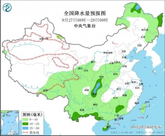 全國降水量預報圖(9月26日08時-27日08時) 圖片來源:中央氣象臺網站