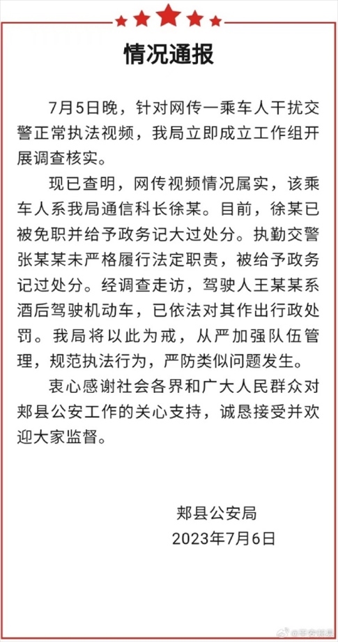 ·平頂山郟縣警方通報(bào)“男子掏警官證讓交警放行”:涉事人被免職。
