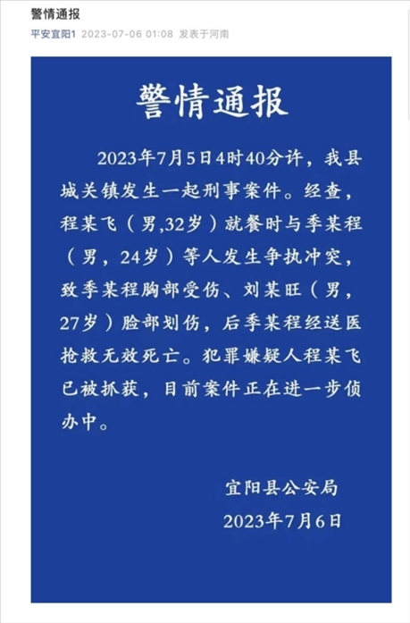 ·河南宜陽(yáng)多名男子街頭起沖突1人胸部被扎,警方通報(bào):致1死1傷,嫌疑人已被抓獲。
