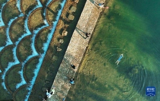 7月11日,人們在杭州臨安高虹鎮(zhèn)的龍鱗壩戲水(無人機照片)。