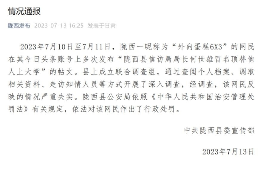 ·信訪局局長被舉報冒名頂替他人上大學(xué),甘肅隴西縣通報:嚴(yán)重失實(shí)!