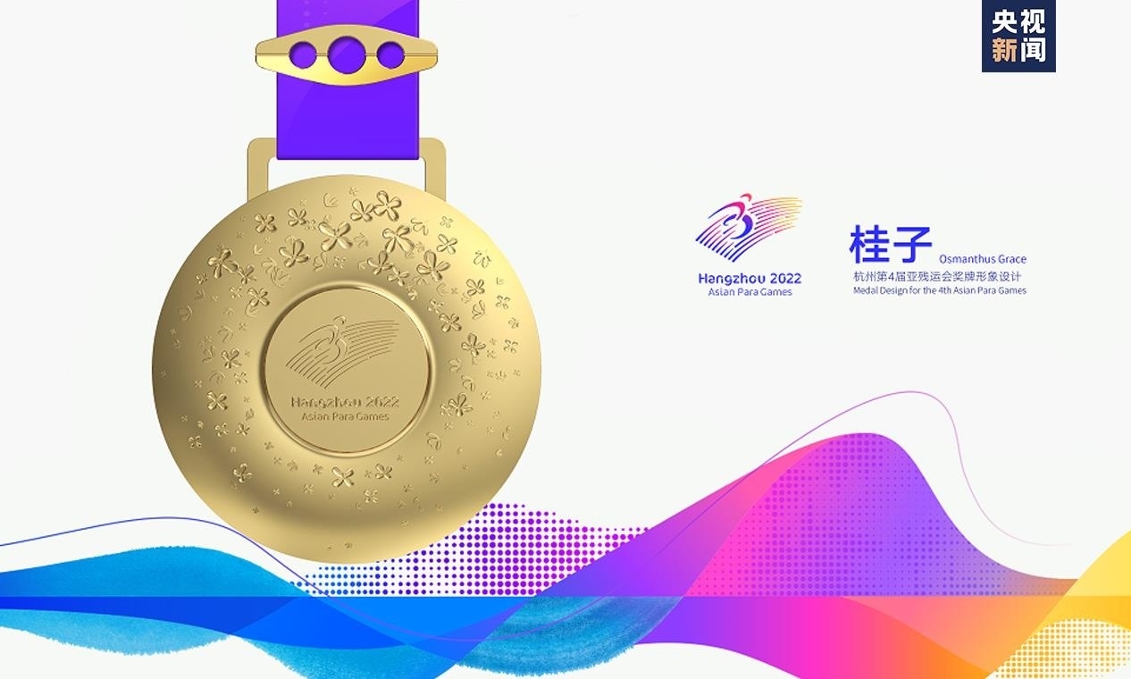 獎牌取名為“桂子”,源自描寫杭州的名句“山寺月中尋桂子”,寓含江南意境和浪漫色彩。系繼會徽“向前”,吉祥物“飛飛”,色彩系統(tǒng)“潤澤”,火炬“桂冠”后又一杭州亞殘運會視覺形象體系的核心元素,是亞殘運文化美學的重要表達。