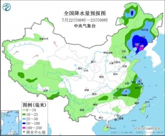 圖2 全國降水量預(yù)報圖(7月21日08時-22日08時)