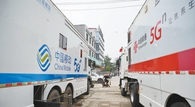 8月3日,應(yīng)急通信車輛在河北涿州市第三中學(xué)安置點(diǎn)外保障通信。新華社記者 牟 宇攝