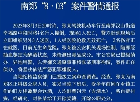 ·陜西漢中市一正科級(jí)公職人員張某,醉酒開車撞倒4人,致2死2傷。張某被開除黨籍、公職。