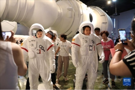 小朋友們?cè)谖挥谏蜿柺械倪|寧省科技館里航天展區(qū)參觀留影。