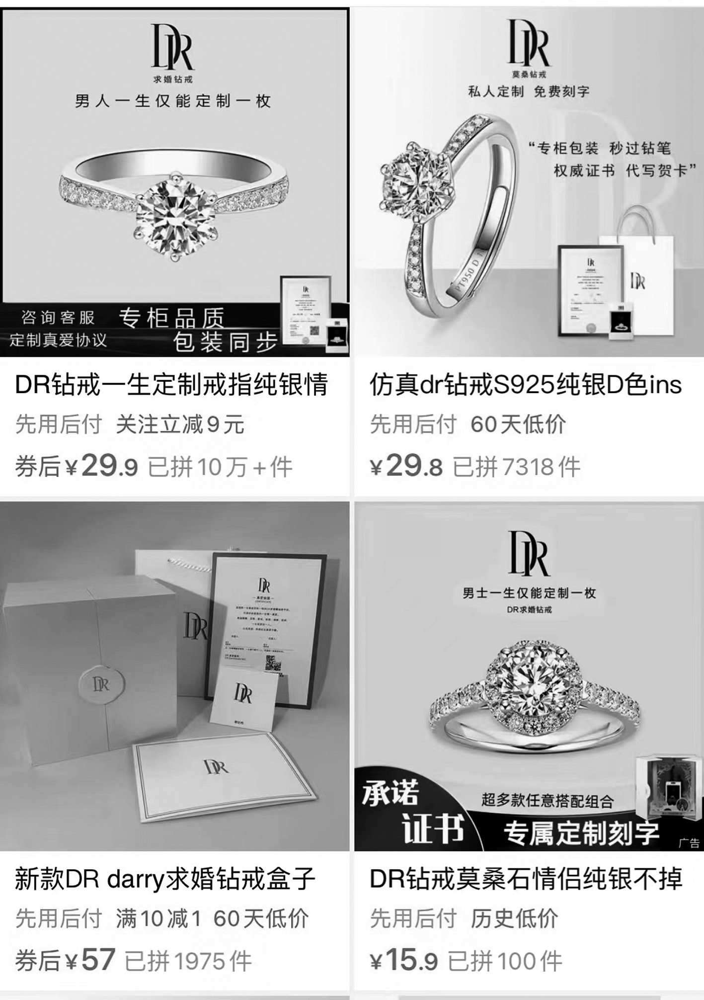 記者在一家電商平臺輸入“DR鉆戒”,映入眼簾的商品售價只要幾十塊,幾乎都把“男士一生僅能定制一枚”作為賣點。還有商家寫道,“專柜品質(zhì)、包裝同步”“咨詢客服定制真愛協(xié)議”。