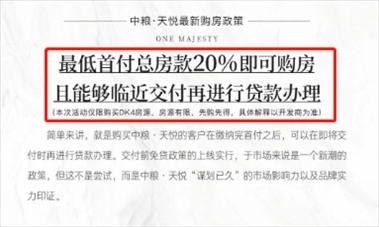 8月26日,紅星資本局向“中糧天悅”售樓部求證此時(shí),一名置業(yè)顧問(wèn)回復(fù)稱,最近確實(shí)推出了“先交付后還貸”的購(gòu)房政策,購(gòu)房者可以先交首付,簽訂購(gòu)房合同,交房前再辦理貸款即可。