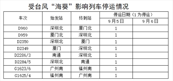 據(jù)中央氣象臺(tái)消息,今年第11號(hào)臺(tái)風(fēng)“??庇诮裉欤?月5日)早晨5點(diǎn)20分前后在福建省東山縣沿海登陸,福建東部部分地區(qū)將有大暴雨,并伴有短時(shí)強(qiáng)降水,局地有雷暴大風(fēng)等強(qiáng)對(duì)流天氣。為防范臺(tái)風(fēng)影響,保障鐵路運(yùn)輸安全,中國(guó)鐵路南昌局集團(tuán)有限公司繼續(xù)調(diào)整部分旅客列車運(yùn)行方案,停運(yùn)管內(nèi)途經(jīng)杭深線福州南至詔安,龍漳線龍巖至漳州,昌福線三明北至福州等區(qū)段旅客列車。同時(shí),加開15趟旅客列車,方便旅客出行。