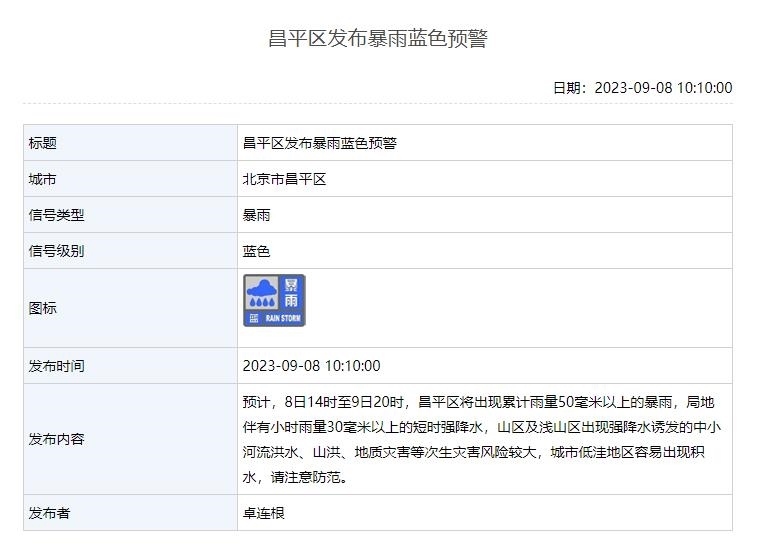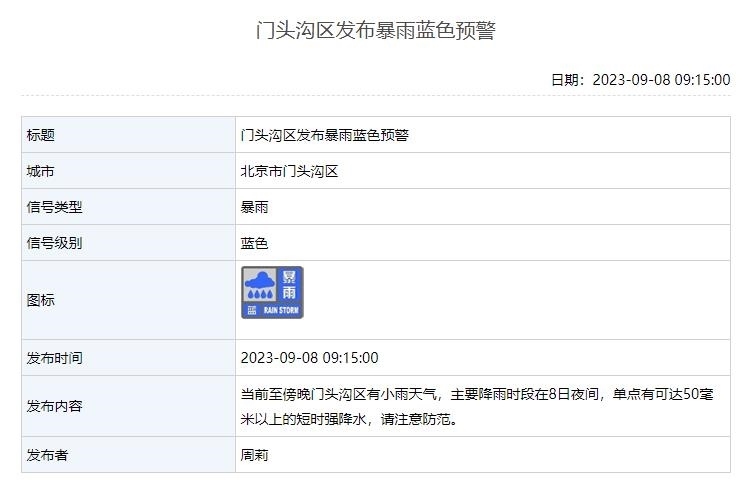 9月8日10時(shí)北京發(fā)布暴雨藍(lán)色預(yù)警 昌平區(qū)有暴雨、門(mén)頭溝區(qū)有雨