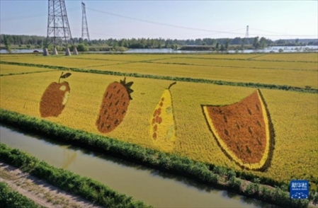初秋時(shí)節(jié),遼寧省鞍山市臺(tái)安縣遼河文化旅游景區(qū)的稻田畫(huà)吸引不少游客前來(lái)參觀(guān)游覽。由多種顏色組成的巨型稻田畫(huà)勾勒出豐收壯美景象。