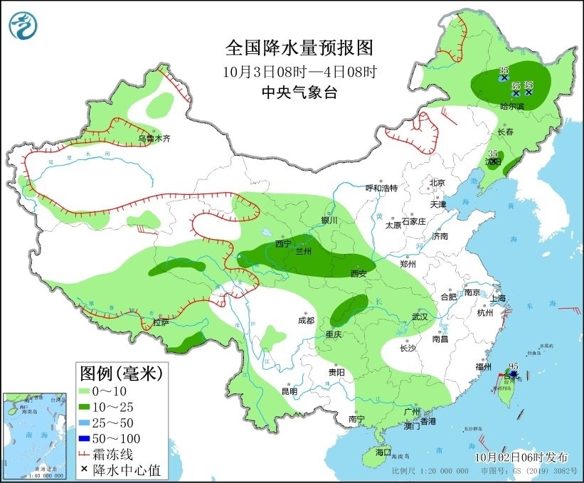 10月3日08時(shí)至4日08時(shí),黑龍江西南部、遼寧東部、西藏東南部、青海東部、甘肅東南部、陜西中南部、重慶北部以及臺(tái)灣島北部等地部分地區(qū)有中到大雨,其中,臺(tái)灣島北部和東部等地部分地區(qū)有暴雨(50~95毫米)。內(nèi)蒙古東南部、西藏北部等地部分地區(qū)有4~6級(jí)風(fēng)。渤海、渤海海峽、黃海大部、東海北部將有6~7級(jí)風(fēng)、陣風(fēng)8級(jí),東海西南部海域風(fēng)力將有7~8級(jí)風(fēng)、陣風(fēng)9級(jí)。臺(tái)灣以東洋面將有7~8級(jí)轉(zhuǎn)9~10級(jí)風(fēng)、陣風(fēng)9級(jí)轉(zhuǎn)11級(jí)(見(jiàn)圖2)。