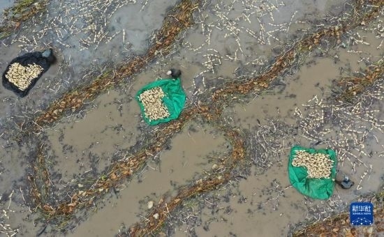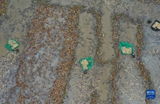 10月5日,河北省新河縣西流鄉(xiāng)西董村一家蓮藕種植合作社的社員在收獲蓮藕(無人機(jī)照片)。