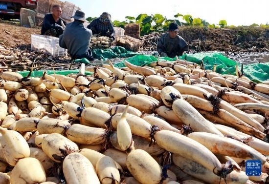 10月5日,河北省新河縣西流鄉(xiāng)西董村一家蓮藕種植合作社的社員在收獲蓮藕。