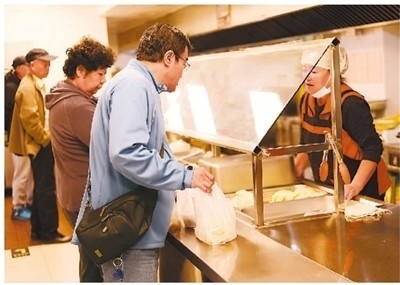 10月13日,吉林省長(zhǎng)春市新區(qū)飛躍街道三佳社區(qū)敬老餐廳內(nèi),老年市民正在選取午餐。曹建雄攝(人民視覺(jué))