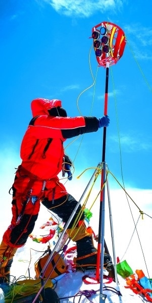 “2020珠峰高程測(cè)量登山隊(duì)”成功登頂世界第一高峰珠穆朗瑪峰,隊(duì)員在峰頂開展測(cè)量工作。扎西次仁攝